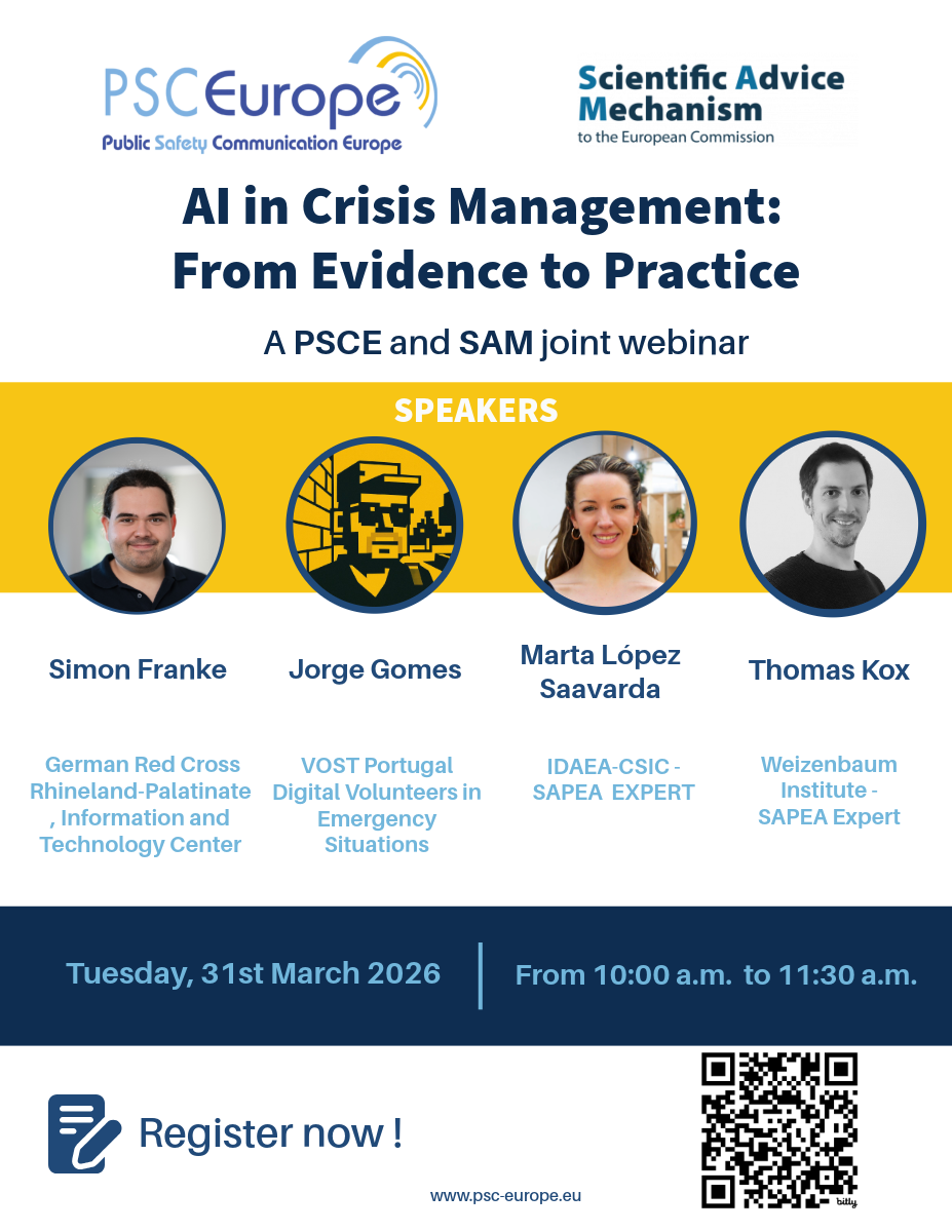 Public Safety Communication Europe, in collaboration with the Scientific Advice Mechanism (SAM), is organising a webinar on the role of Artificial Intelligence in emergency and crisis management.